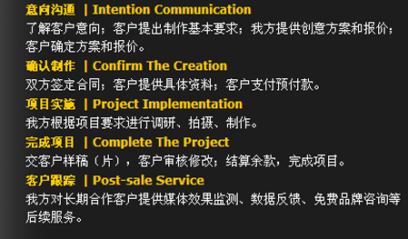 意向溝通 | Intention Communication 十年磨一劍,經(jīng)典影視已經(jīng)成為業(yè)內(nèi)規(guī)?;放苽鞑I(yè)機(jī)構(gòu)。   思想力——Idea Create Value! 品牌傳播相信:只有與眾不同的創(chuàng)意,才能為客戶創(chuàng)造價(jià)值!出色的藝術(shù)是創(chuàng)意品牌的保證;我們是客戶的伙伴,我們并肩作戰(zhàn),只為創(chuàng)造一個(gè)偉大的品牌。   智慧力——創(chuàng)作團(tuán)隊(duì) 創(chuàng)意總監(jiān)——創(chuàng)意來自生活,高于生活 美術(shù)指導(dǎo)——身手敏捷,思想敏銳,具有獨(dú)特的美術(shù)嗅覺 資深策劃——思維縝密而又膽識過人,常常給人意外之喜 經(jīng)典影視.品牌傳播,采用國際化的Team作業(yè)模式——   保證力——作業(yè)流程 我們一直相信,只有科學(xué)、規(guī)范的作業(yè)流程作為運(yùn)作保障,優(yōu)秀的創(chuàng)意才能得以完美的實(shí)施。在經(jīng)典影視,我們一直秉承——策略精準(zhǔn) . 創(chuàng)意新銳 . 執(zhí)行出色。